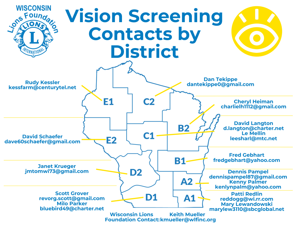 The Vision Screening Chair associated with your district will be happy to assist in setting up a screening at your location. Please look at the map to find which Vision Screening Chair is the contact for your area. If you are unsure after reviewing the map, please contact our Project Director at kmueller@wlfinc.org.