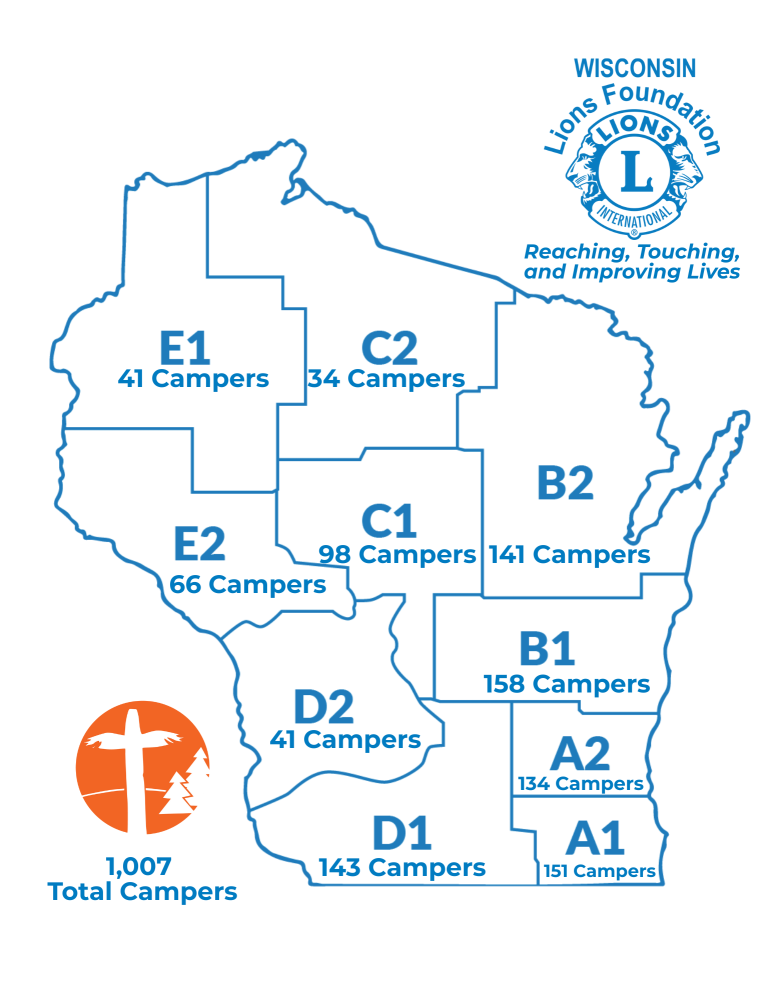 Participation spanned across all 10 Lions Districts in the state of Wisconsin. District B1 had the highest attendance with 158 campers, closely followed by A1 with 151 and D1 with 143. Other district totals included A2 (134), B2 (141), C1 (98), C2 (34), D2 (41), E1 (41), and E2 (66).